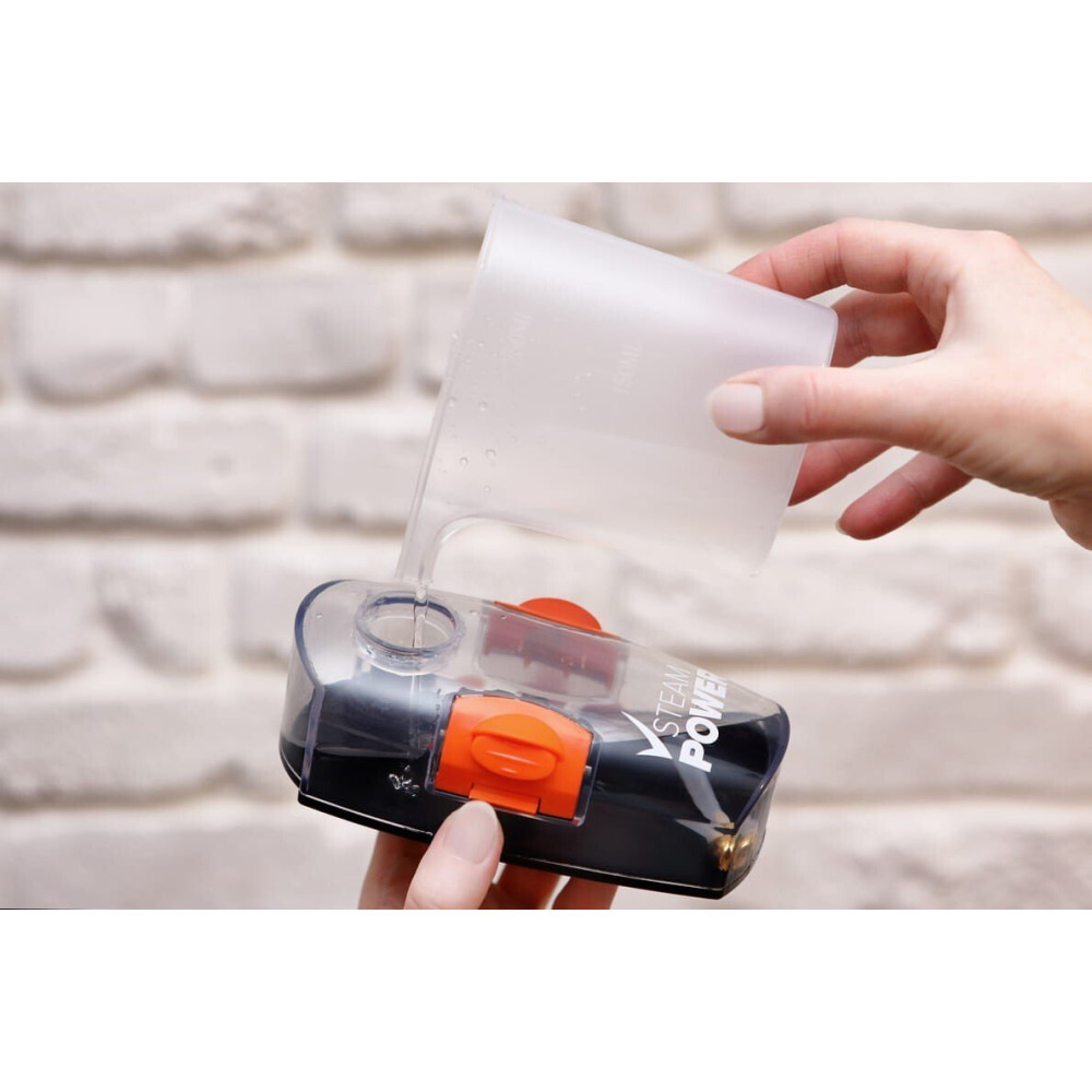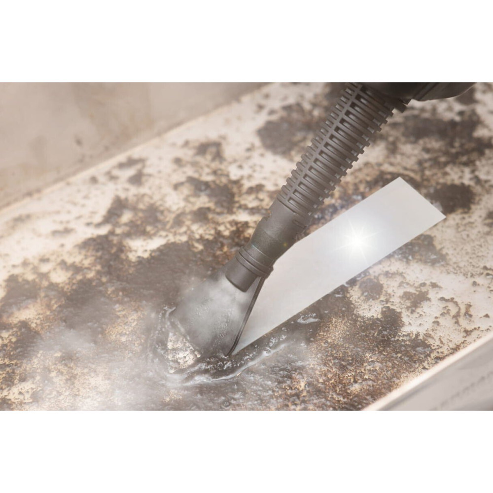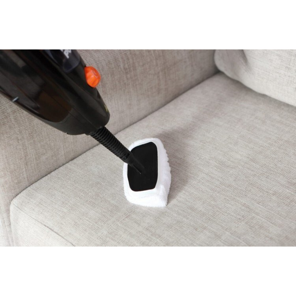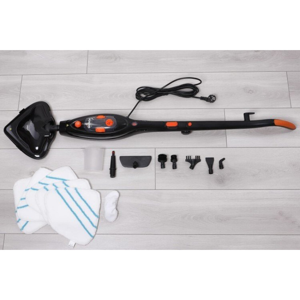- Комплектация большая насадка из микрофибры (5 шт.), малая насадка из микрофибры, насадка для ковров, мерный стакан, скребок, большая и малая пластиковые щетки, насадка для швов, угловая насадка, лопатка/скребок