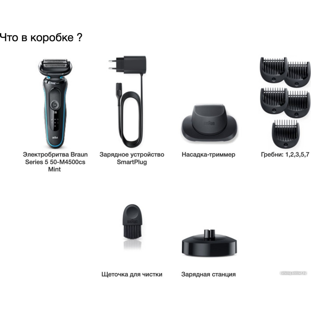 • Комплект поставки защитная крышка, щеточка для чистки, зарядное устройство (+ зарядная станция), гребень (5 шт.), триммер для точного подравнивания