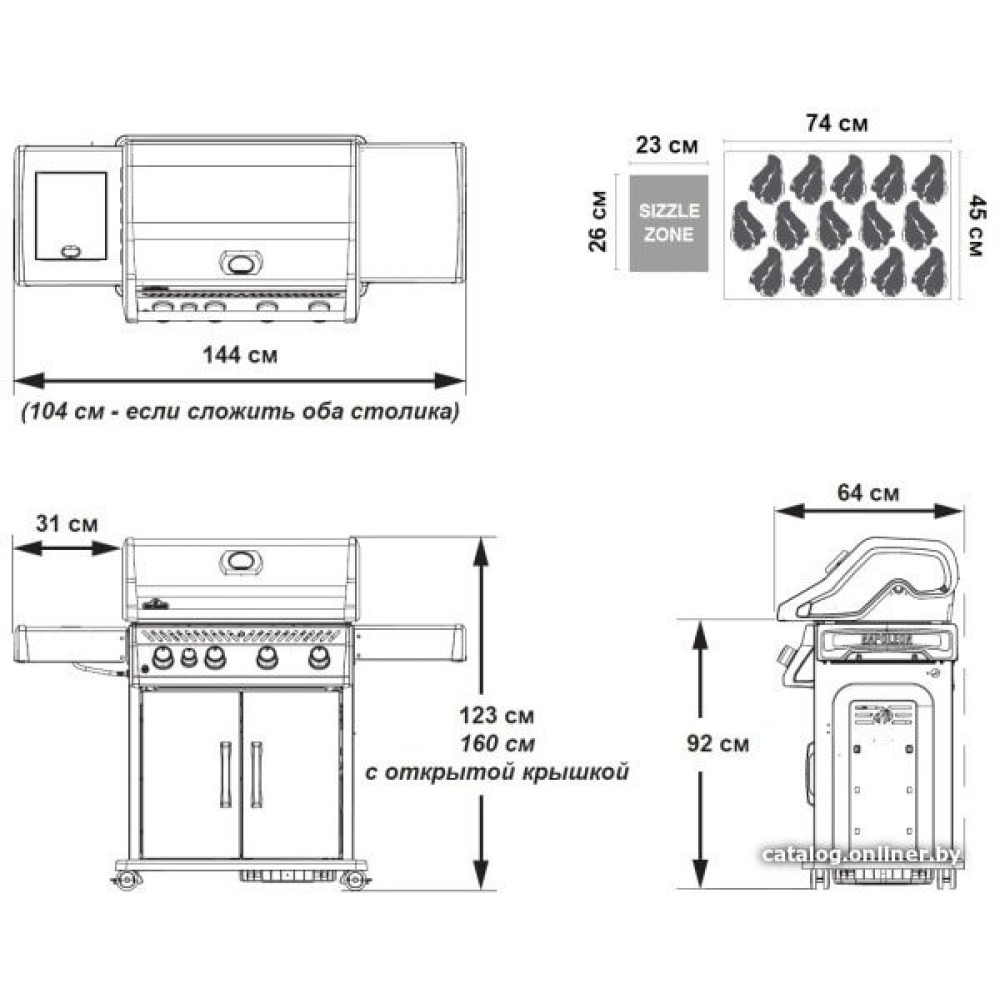 гриль-решетка, сталь, столики, полка для дров (принадлежностей), колеса, 64x144x123 см