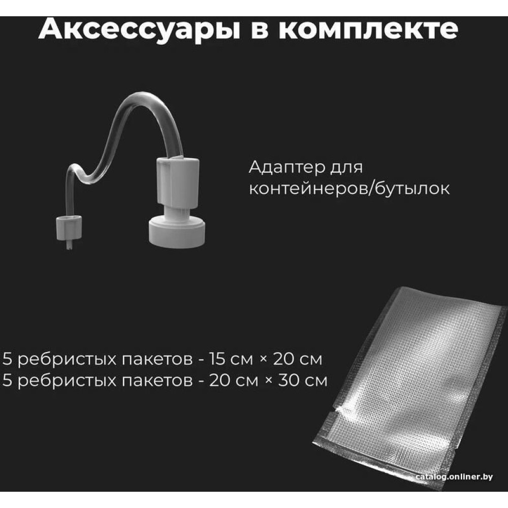 • Комплектация Адаптер для вакуумных контейнеров/бутылок 5 ребристых пакетов - 15 см × 20 см 5 ребристых пакетов - 20 см × 30 см