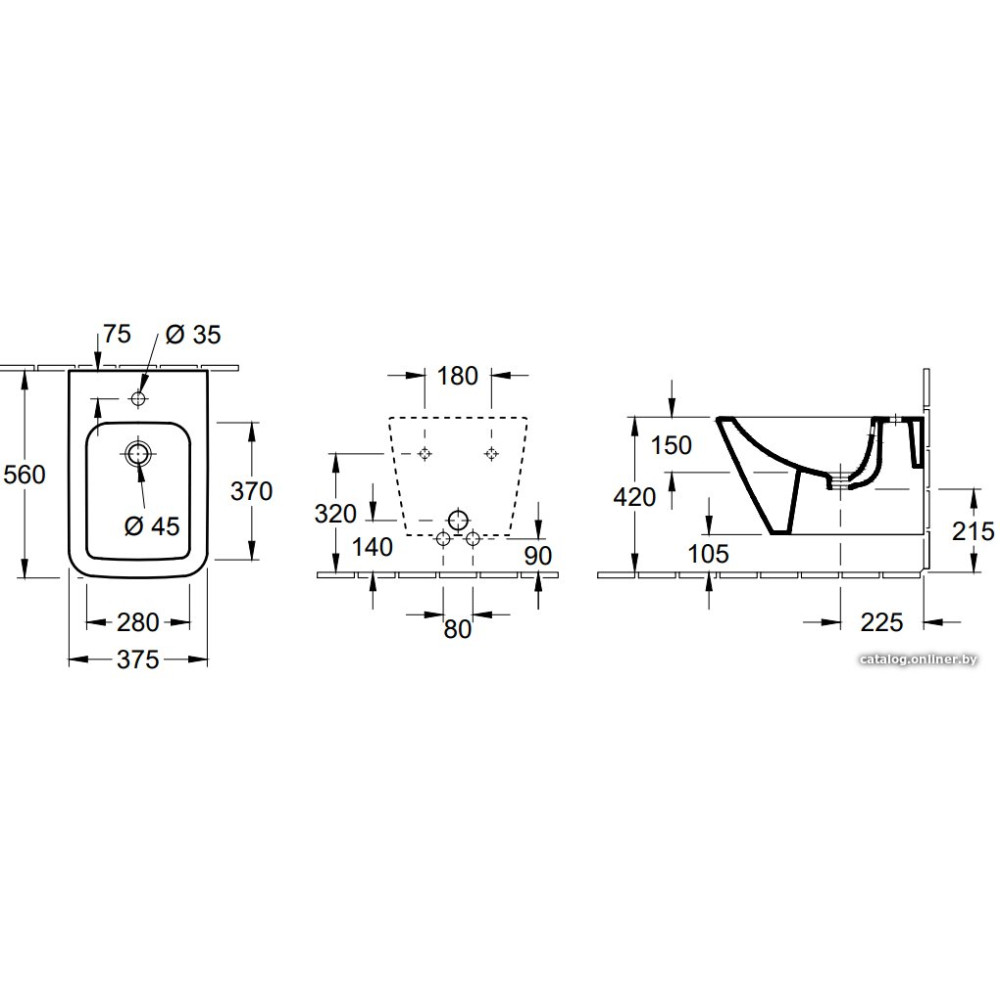 подвесной монтаж, прямоугольная чаша, горизонтальный выпуск, с отверстием под смеситель, с переливом, без крышки, 37.5x56x42 см, белый цвет
