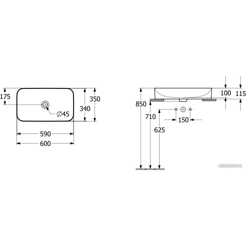 60x35 см, с одной чашей, накладной, крепление на столешницу