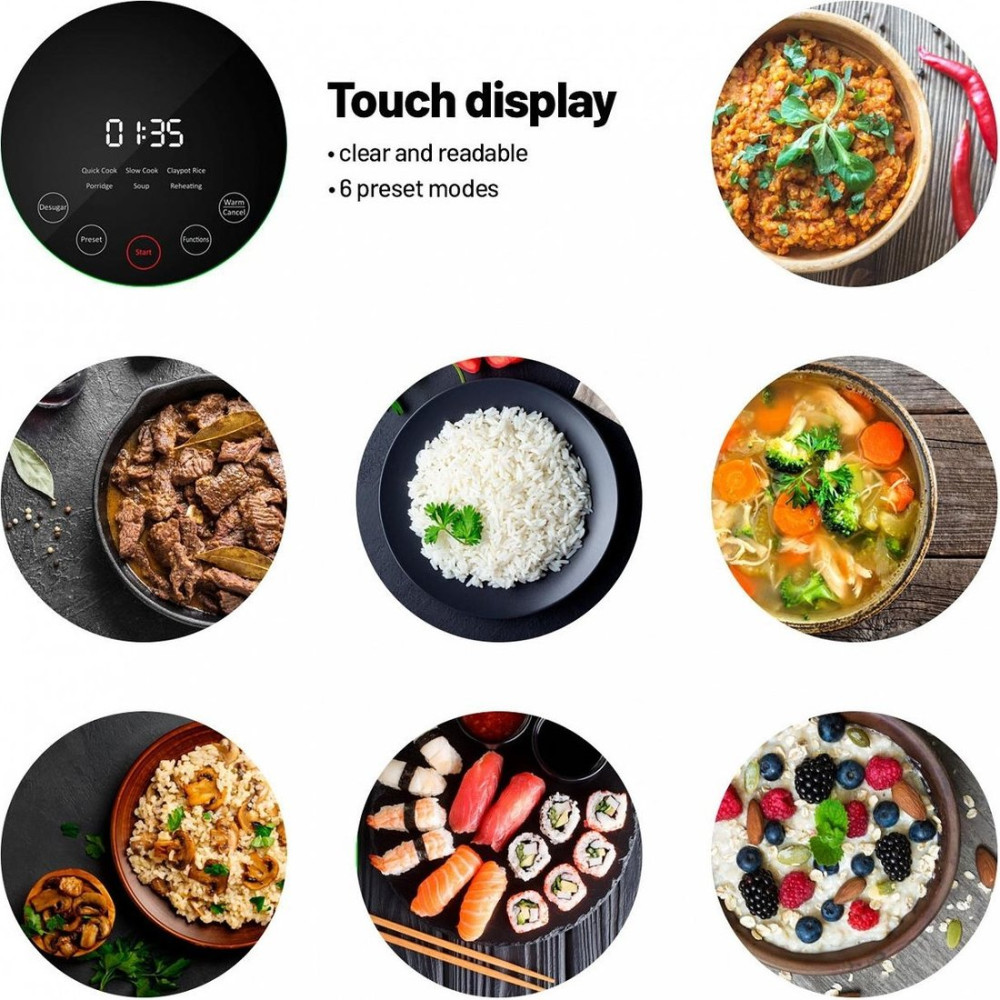 • Перечень режимов работыБыстрое приготовление, медленное приготовление, глиняный рис в горшочке, каша, суп, разогрев