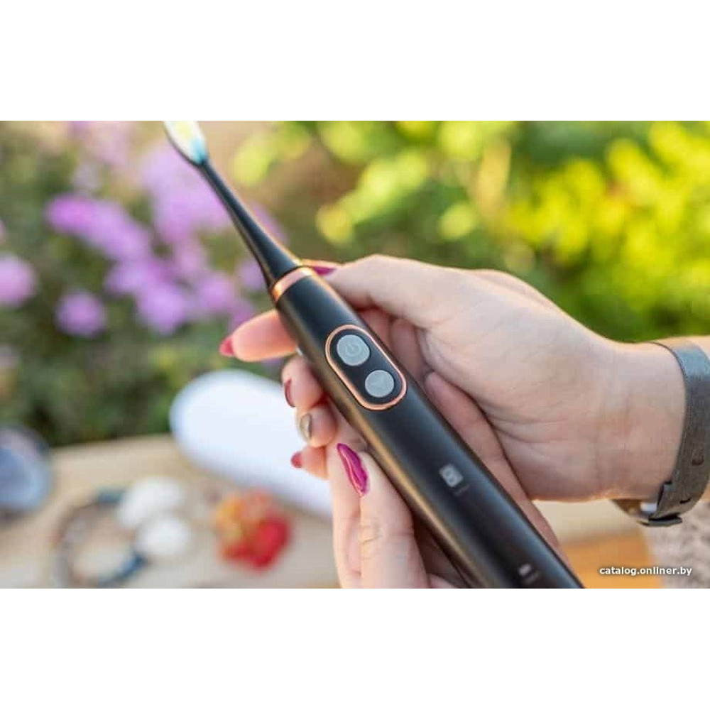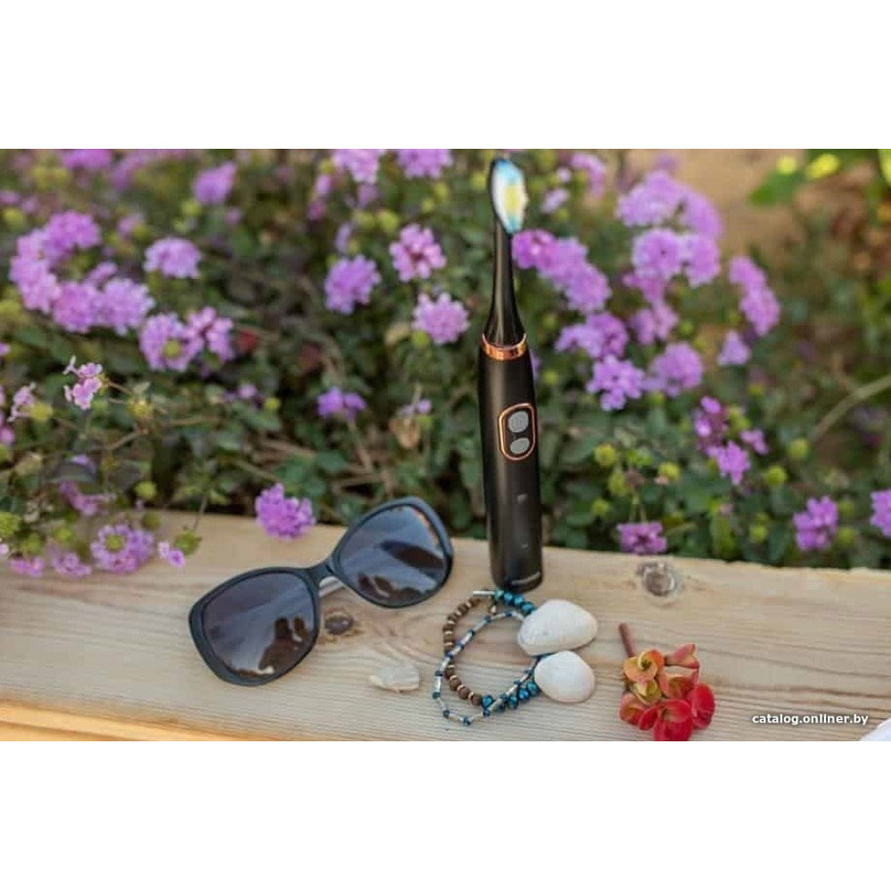 зубная щетка, мягкая чистка/отбеливание/массаж/чистка языка, питание от аккумулятора, движение головки: пульсация, дисплей, в комплекте: футляр, колпачок для насадки, подставка-зарядная база, количество насадок: 2