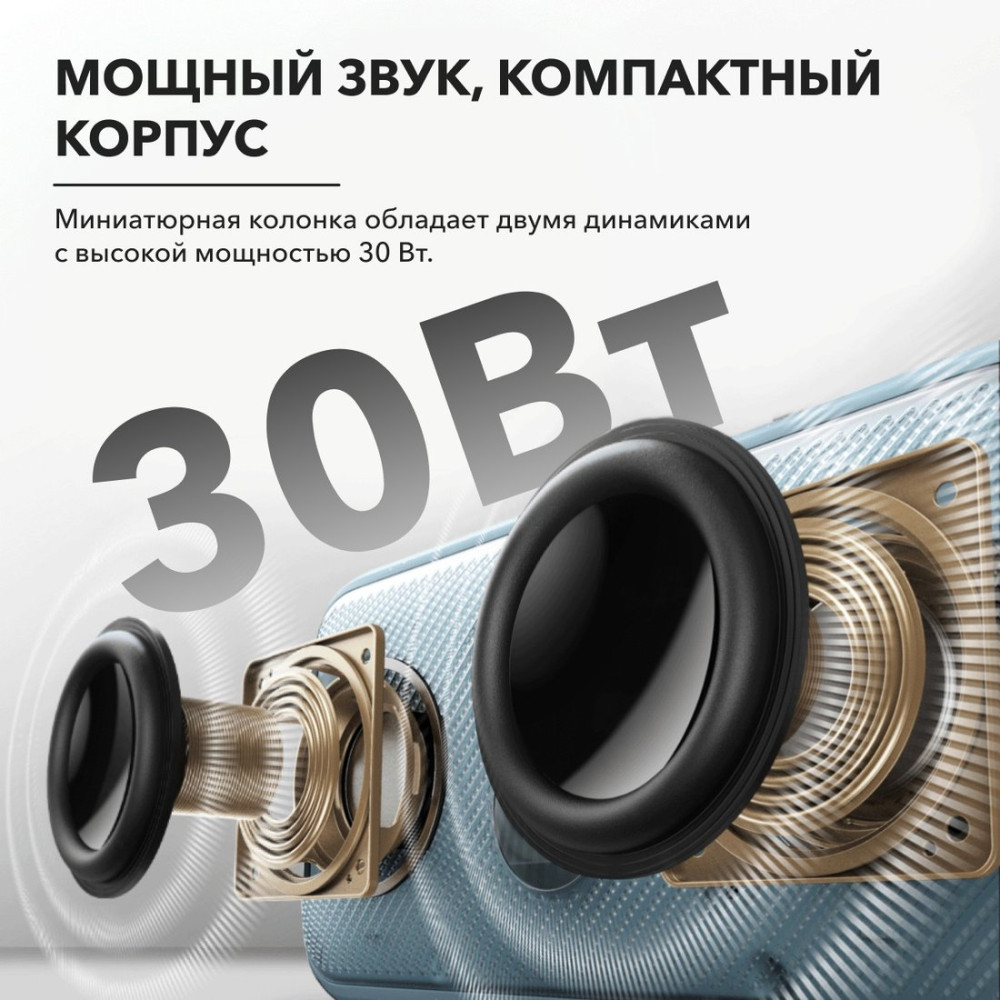 номинальная мощность 30 Вт, питание от аккумулятора, BT 5.3, влагозащита IPX7, время работы: 13 ч.
