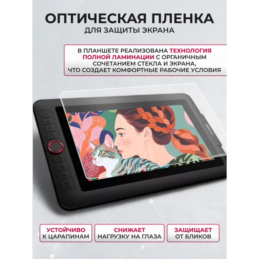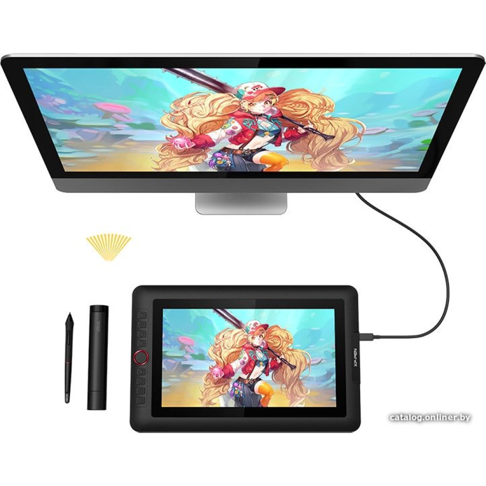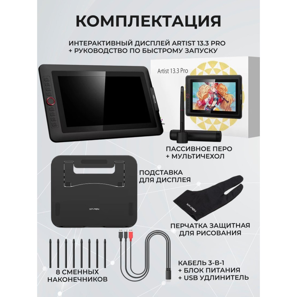 • Комплект поставки- дисплей; - подставка для дисплея; - перо с подставкой и сменными наконечниками; - кабель 3-в-1; - USB-удлинитель; - адаптер питания; - HDMI - Mac адаптер; - перчатка; - салфетка; - ПО и документация.