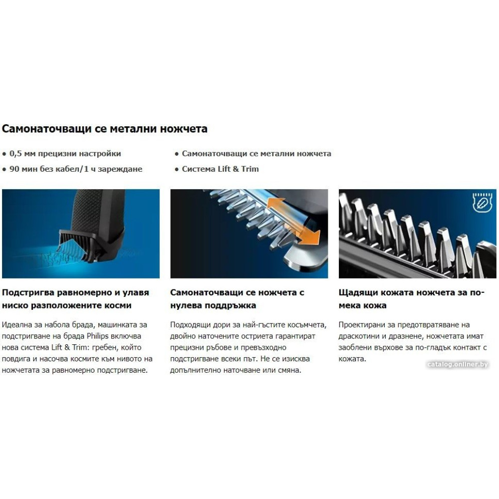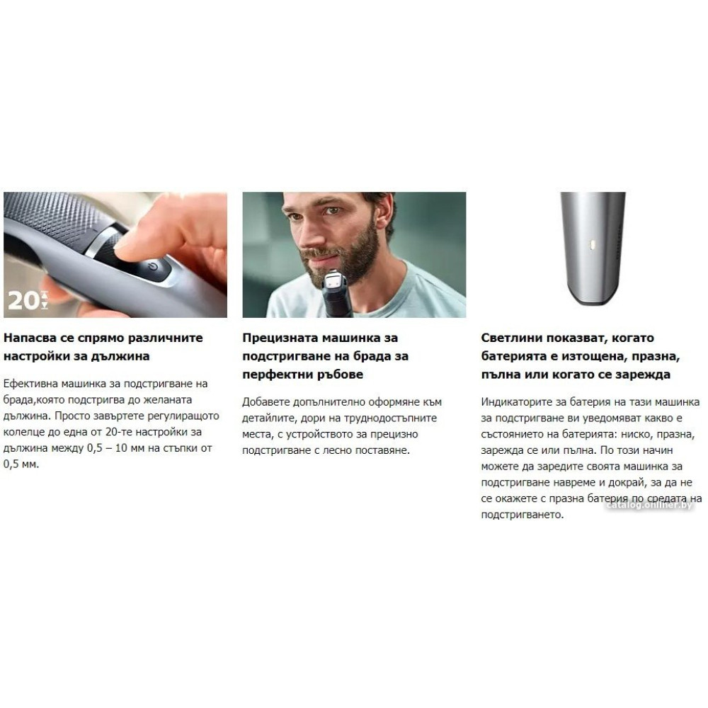 для бороды и усов, длина стрижки: 0.5-10 мм, питание от аккумулятора, автономная работа: 90 мин, влажная чистка головки, не требует смазки