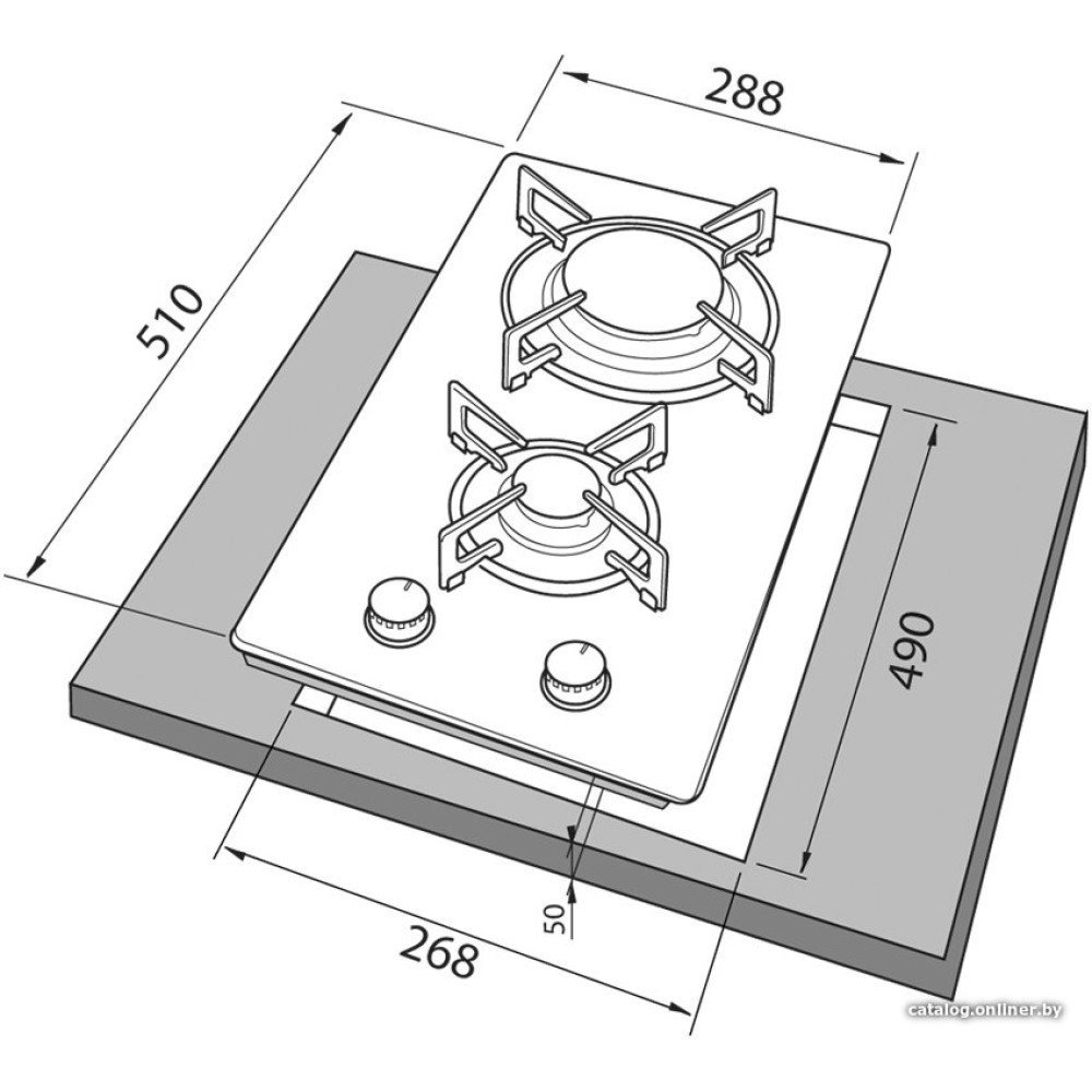 газовая на 2 конфорки, закаленное стекло, мощность: 4000 Вт, автоматический электроподжиг, газ-контроль, решетки: чугун, независимая установка, размеры (ШхГ): 28.8x51 см
