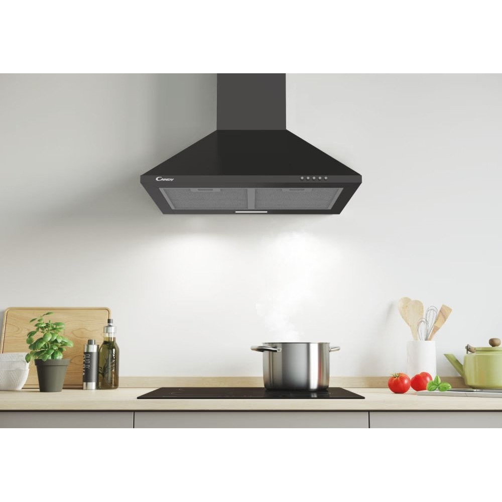 конструкция купольная, монтаж настенный, ширина 60 см, управление механическое/кнопочное, производительность мотора 402 м³/ч, цвет черный