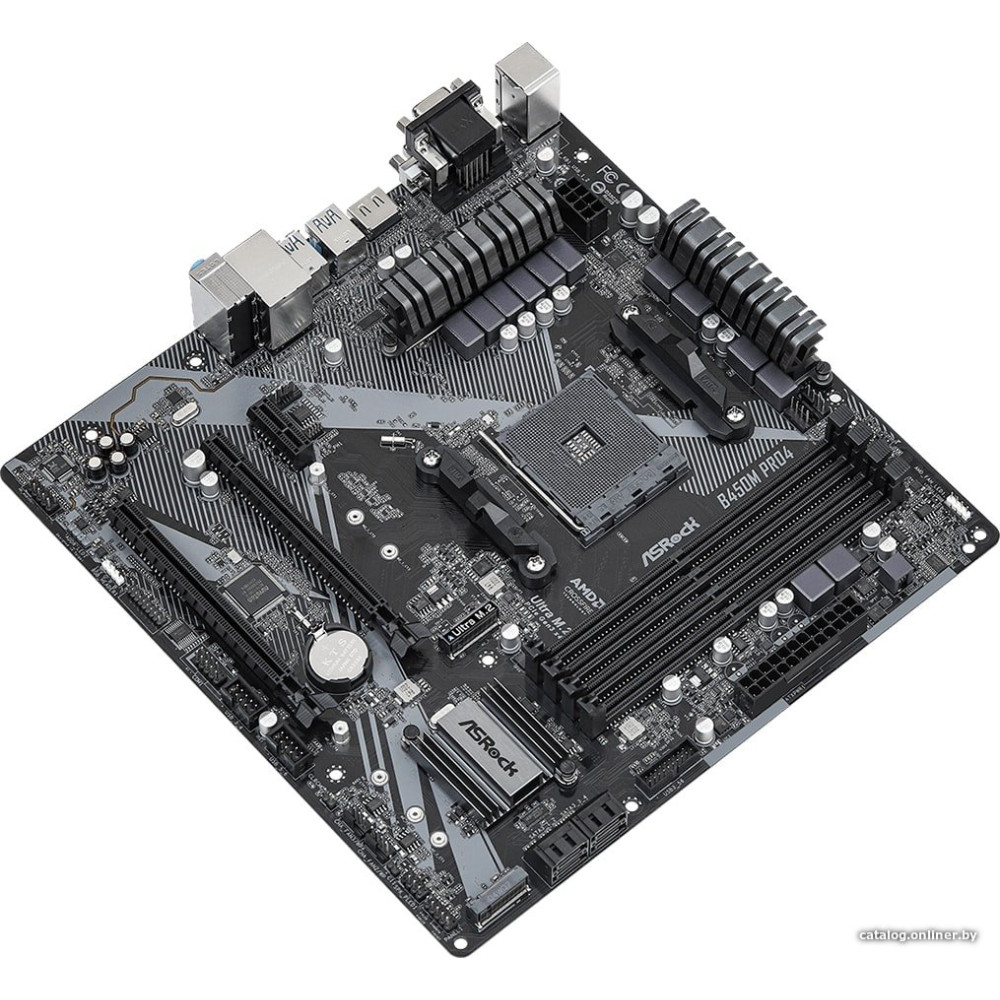 mATX, сокет AMD AM4, чипсет AMD B450, память 4xDDR4, слоты: 2xPCIe x16 3.0, 2xM.2