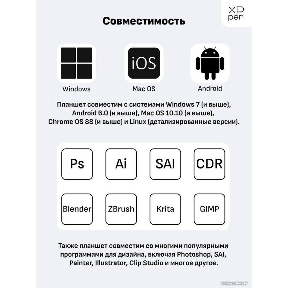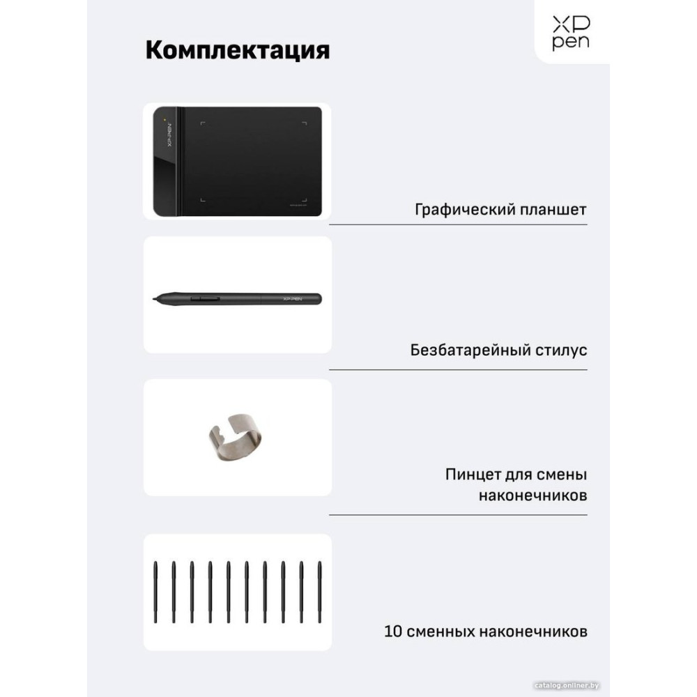 • Комплект поставки- планшет; - перо со сменными наконечниками (10 шт.); - держатель для пера; - документация.