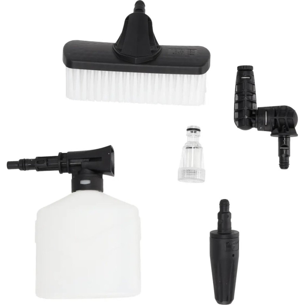 - Комплектация - Мойка - Пистолет для распыления + копье (1 шт.) - Шланг для воды высокого давления (1 шт.) - Фильтр (1 шт.) - Плоская щетка (1 шт) - Плоская щетка (1 шт) - Регулируемая ширина струи сопла (1 шт) - Турбо сопло (1 шт) - Вращающаяся насадка 180° (1 шт.) - Очиститель террасы - террасная щетка (1 шт)