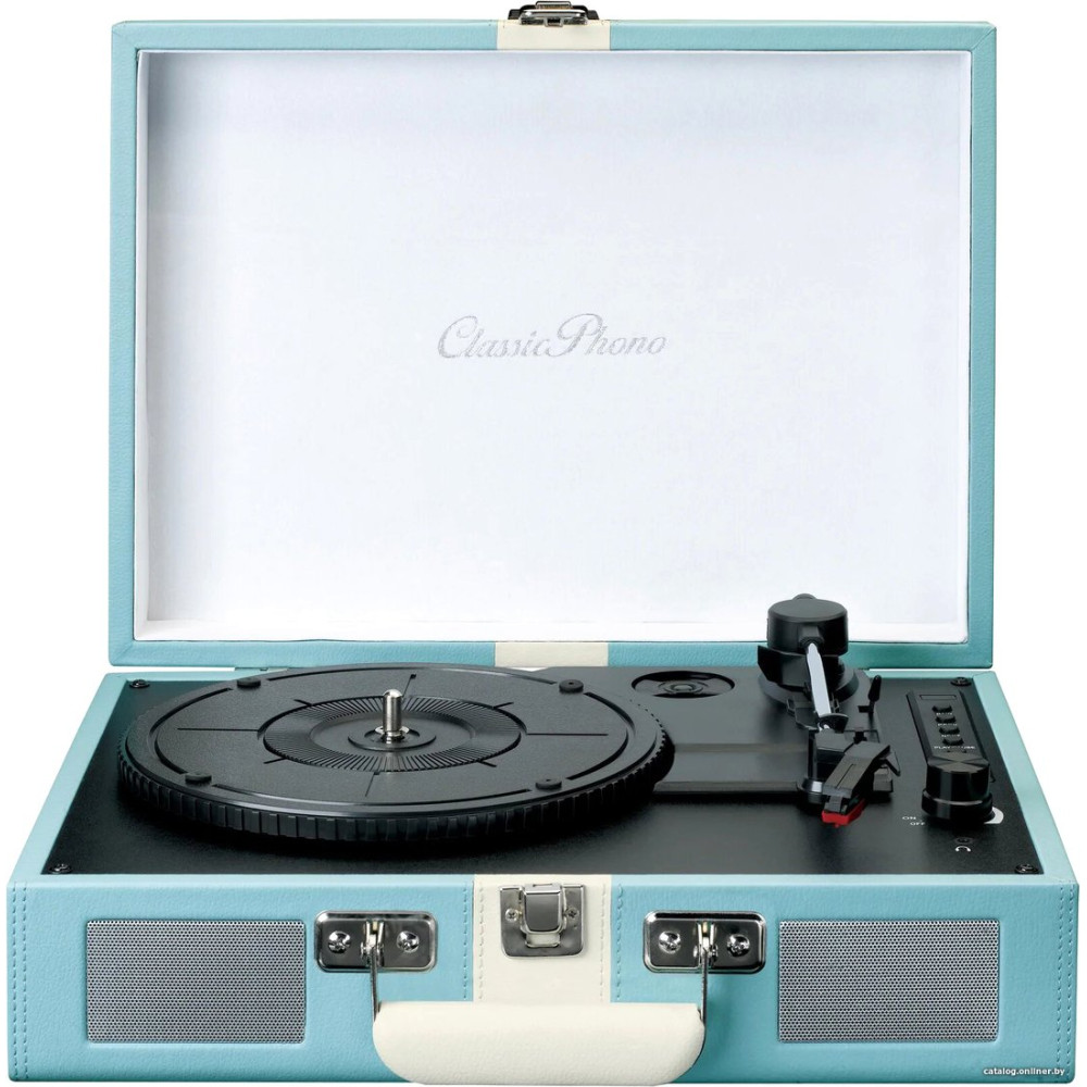 ременной привод, 33 1/3, 45 и 78 об/мин, ручное переключение скоростей, встроенный фонокорректор, тонарм поворотный (прямой), картридж, цвет белый/голубой