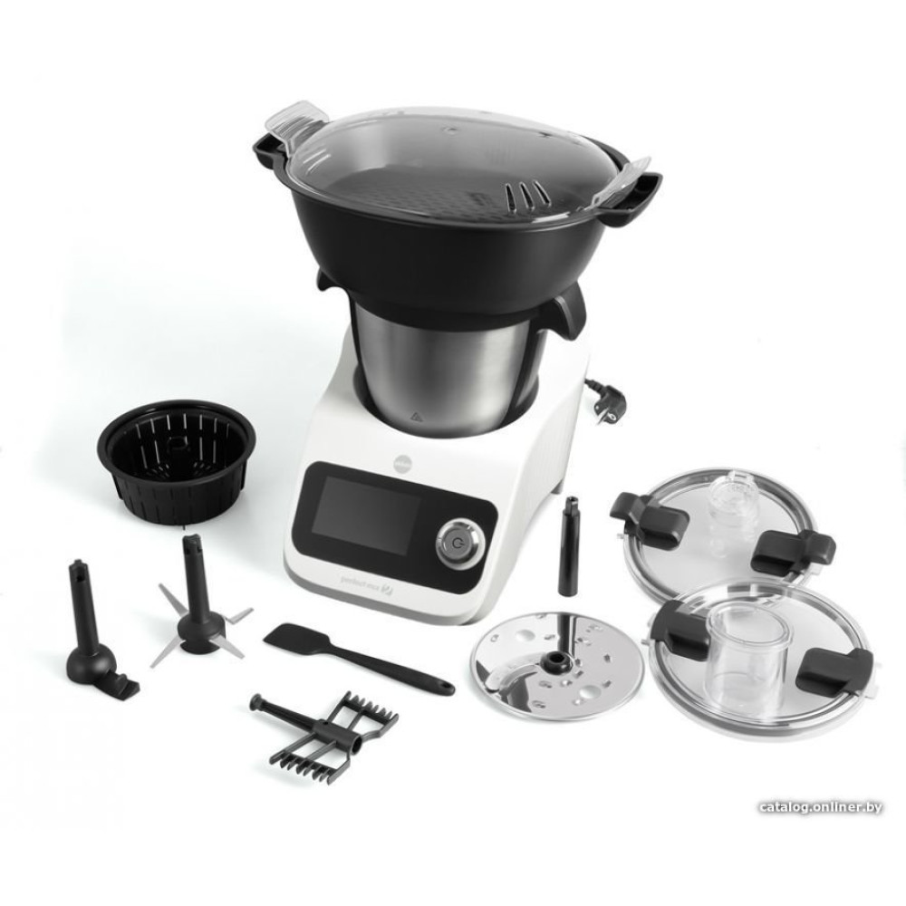 - Полная комплектацияЧаша для смешивания из нержавеющей стали емкостью 3,5 л (рабочий объем 2 л), крышка с отверстием, мерный стакан, нож для нарезки, венчик, насадка для смешивания, лопатка, корзина для приготовления на пару и воде, набор для приготовления на пару (контейнер + противень) + крышка) два диска: для шинковки на стружку и ломтики, и для измельчения овощей и фруктов