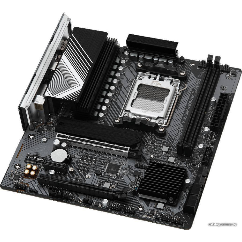 mATX, сокет AMD AM5, чипсет AMD B650, память 2xDDR5, слоты: 2xPCIe x16 4.0, 2xM.2, 8+2+1 фаз питания