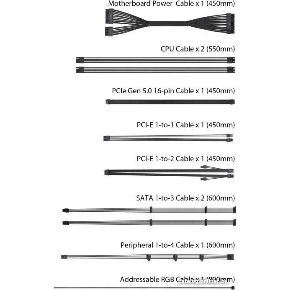 - Комплектация Power Cord x 1 Motherboard Power Cable x 1 (450mm) CPU Cable x 2 (550mm) PCI-E Gen 5 16-pin Cable x 1 (450mm) PCI-E 1-to-1 Cable x 1 (450mm) PCI-E 1-to-2 Cable x 1 (450mm) SATA 1-to-3 Cable x 2 (300+200+100mm) Peripheral 1-to-4 Cable x 1 (300+100+100+100mm) Addressable RGB Cable x 1 (800mm) User Manual x 1 ATX to SFX adapter bracket x 1