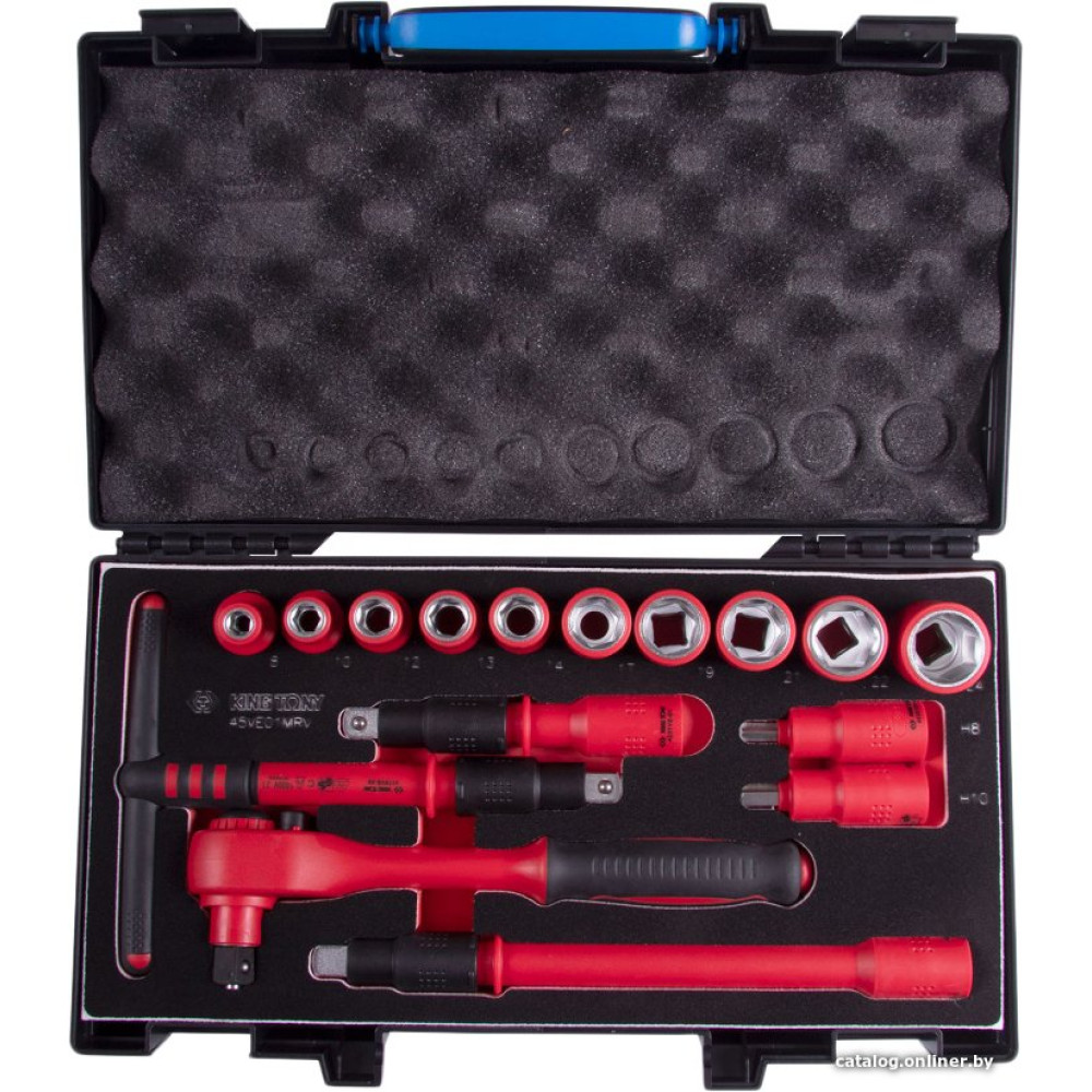 - Комплектация Головки торцевые диэлектрические и принадлежности 1/2": – Короткие 6-гранные – 8, 10, 12, 13, 14, 17, 19, 21, 22, 24 (4335VE) – Трещотка флажковая с кнопкой – 24 зубца, 250 мм (4771VE-10) – Вороток Т-образный – 200 мм (4178VE-08) – Удлинитель – 125 мм (4221VE-05) – Удлинитель – 250 мм (4221VE-10) Насадки (биты) торцевые диэлектрические 1/2": – HEX L=75 мм – H8, H10 (4025VE) Ложемент – EVA, 186 × 375 мм (№8) Пластиковый футляр – ABS, 389 × 229 × 66 мм (820003)
