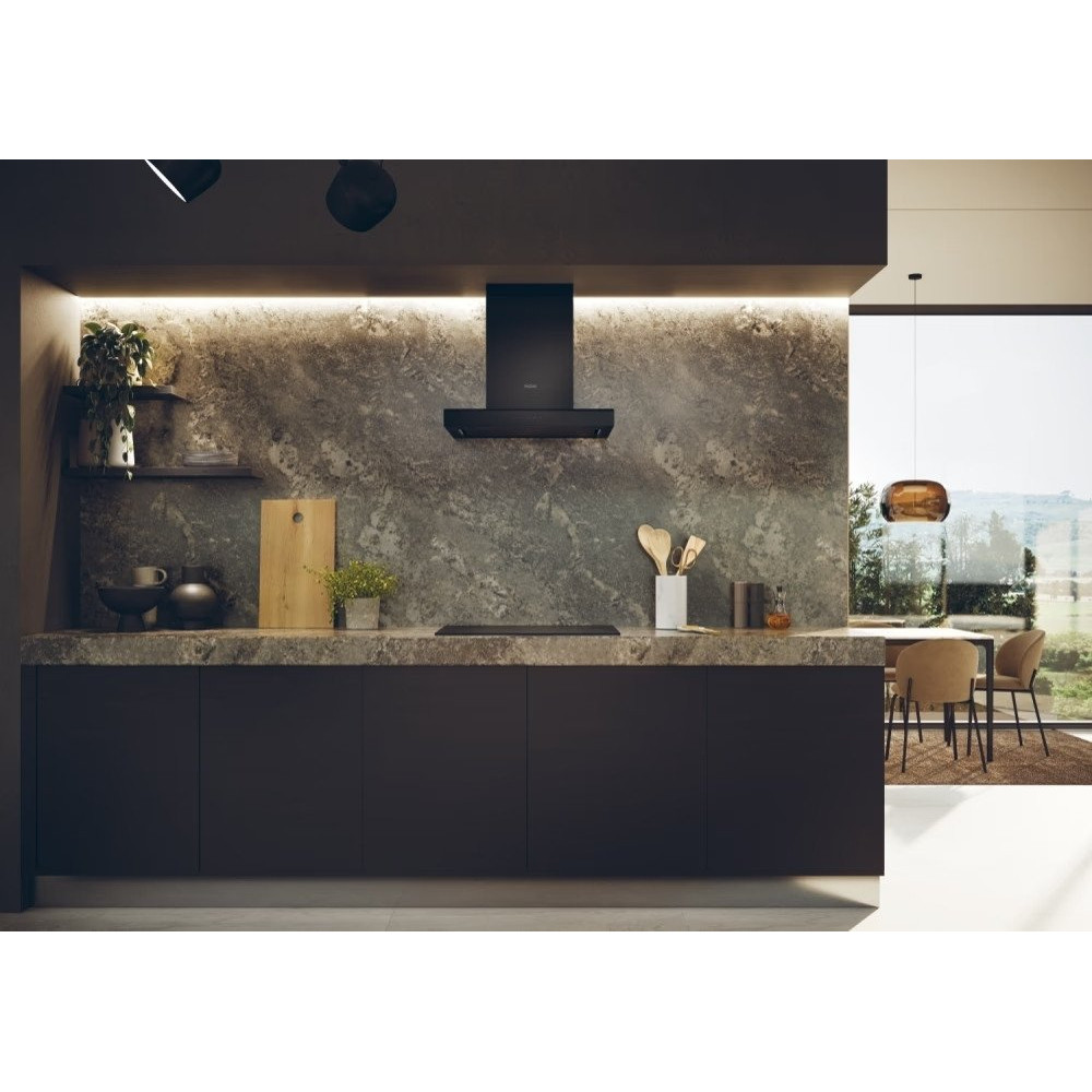 конструкция Т-образная, монтаж настенный, ширина 60 см, управление сенсорное, производительность вытяжки 596 м³/ч, цвет черный