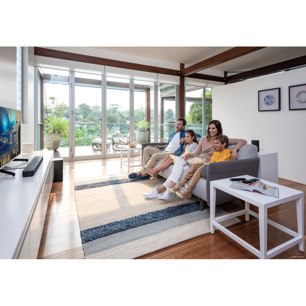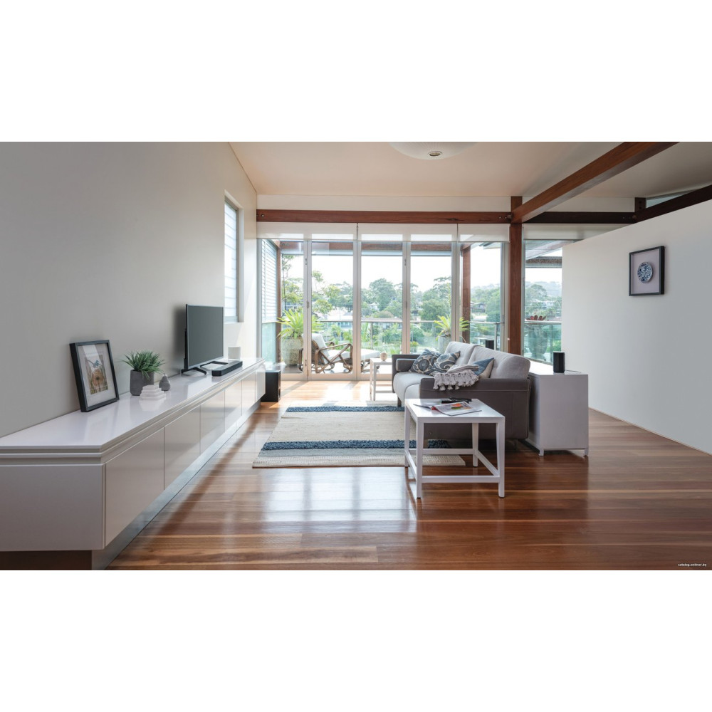 - Состав аудиосистемызвуковая панель, проводной сабвуфер, тыловые колонки