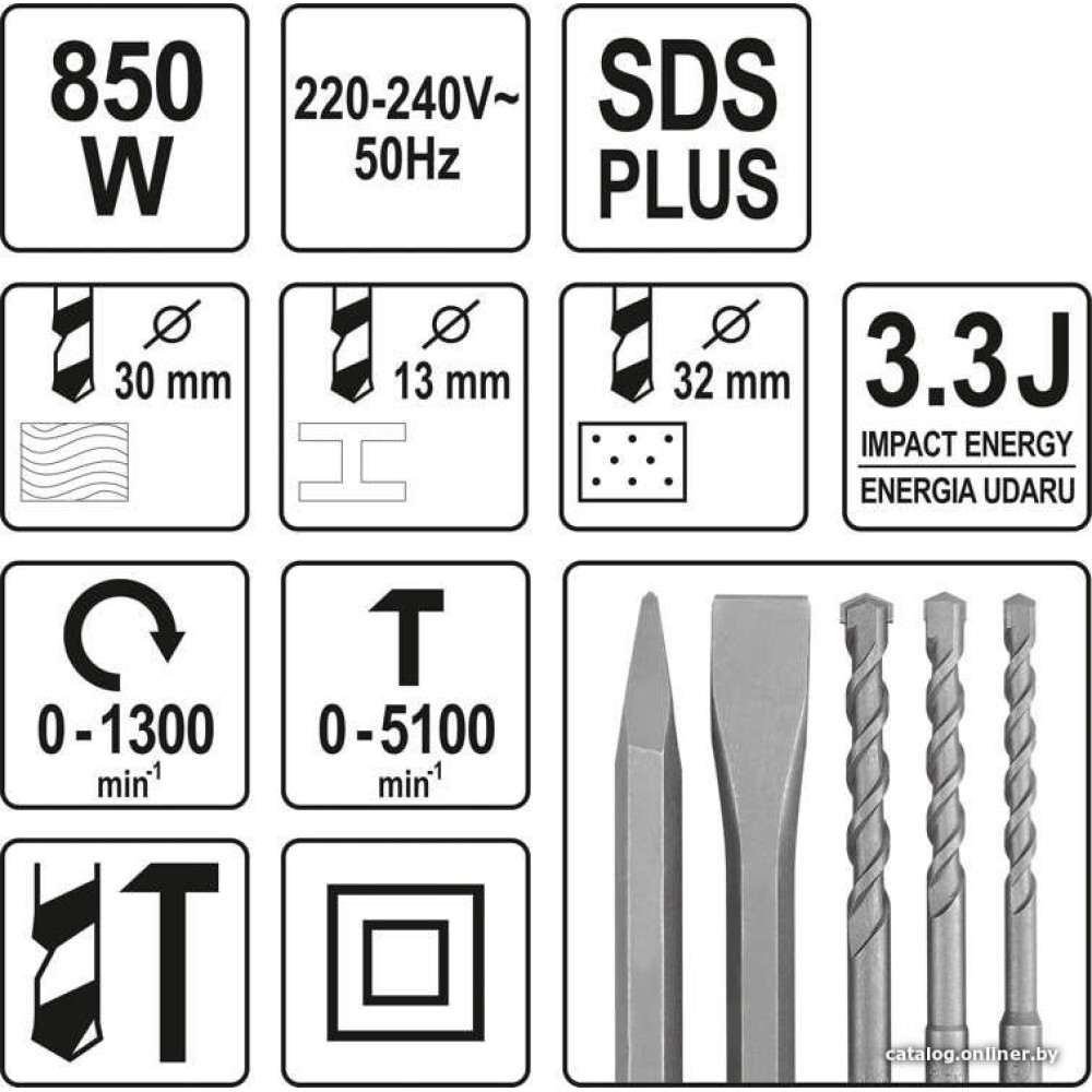 850 Вт, питание: сеть, 5100 ударов/мин, энергия удара: 3.3 Дж, 3500 г